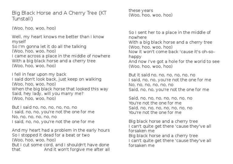 Black Horse And A Cherry Tree. You're not the one for me.' big black horse and a cherry tree, i can't quite get there. Just a song from my mp3.